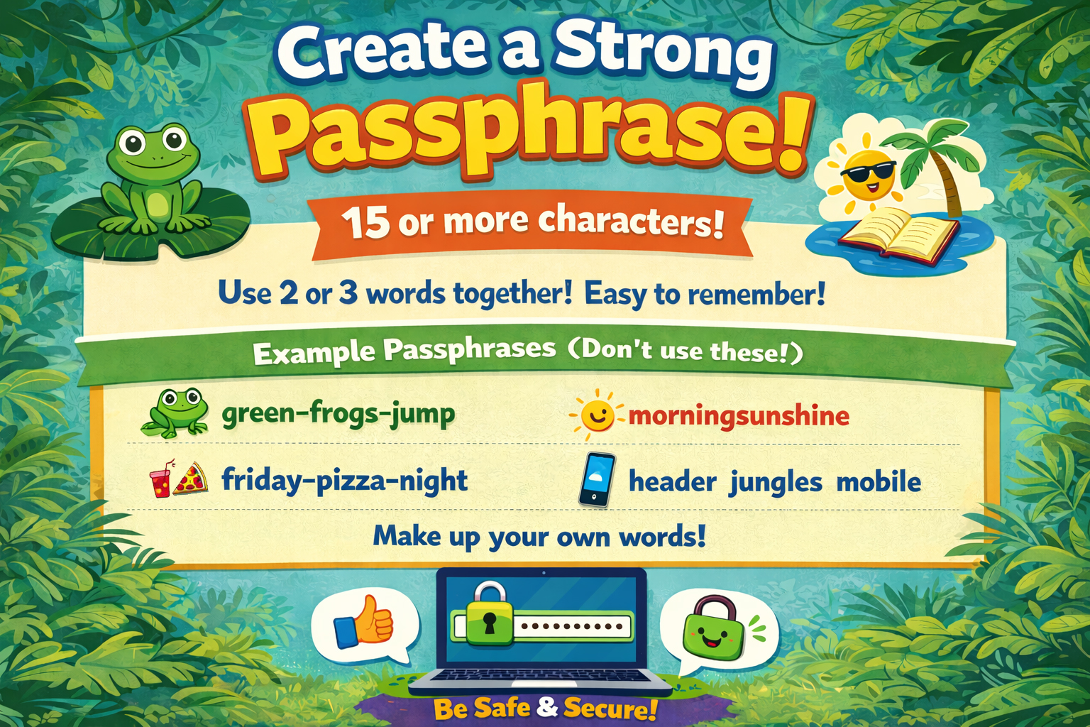 We’ve also made passwords easier to remember. Instead of needing capital letters, numbers, or symbols, your password just needs to be a bit longer. This means you can use what's called a passphrase - a few words joined together.